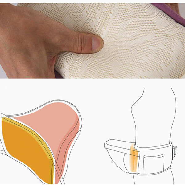 Īpaši veidotā josta bērna pārnēsāšanas laikā nodrošina atbalstu bērna svara vienmērīgam sadalījumam, tādējādi krasi samazinot spiedienu uz muguru.