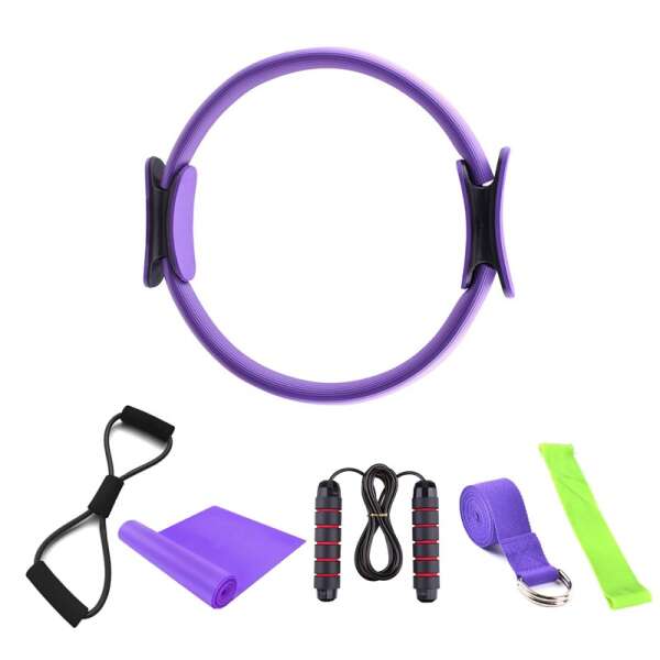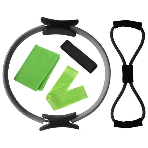 1x Pilates gredzens, 1x lecamaukla, 1x pretestības virve, 1x jogas josta, 2x elastīga josla